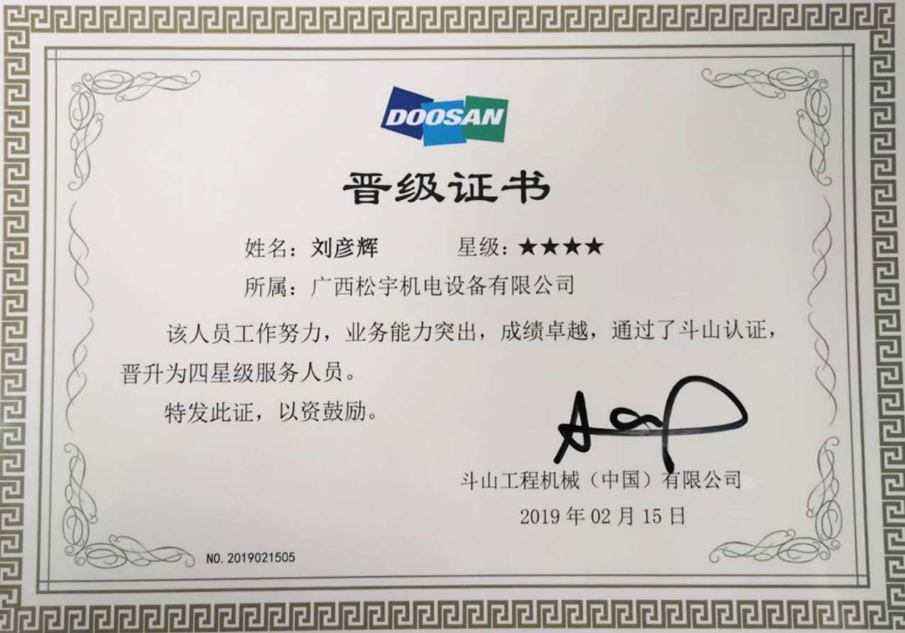 广西快易修刘彦辉获斗山厂家评定为四星级技师