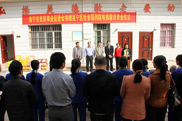 2014年11月26日,在南宁市委市政府及邕宁区政府的组织下,广西松宇企业集团通过南宁光彩事业促进会向邕宁区社会福利院捐赠了50万元的电梯建设资金。南宁市委常委、统战部部长、光彩事业促进会会长,南宁市工商联以及邕宁区委常委、区政府等相关领导出席了捐赠仪式。